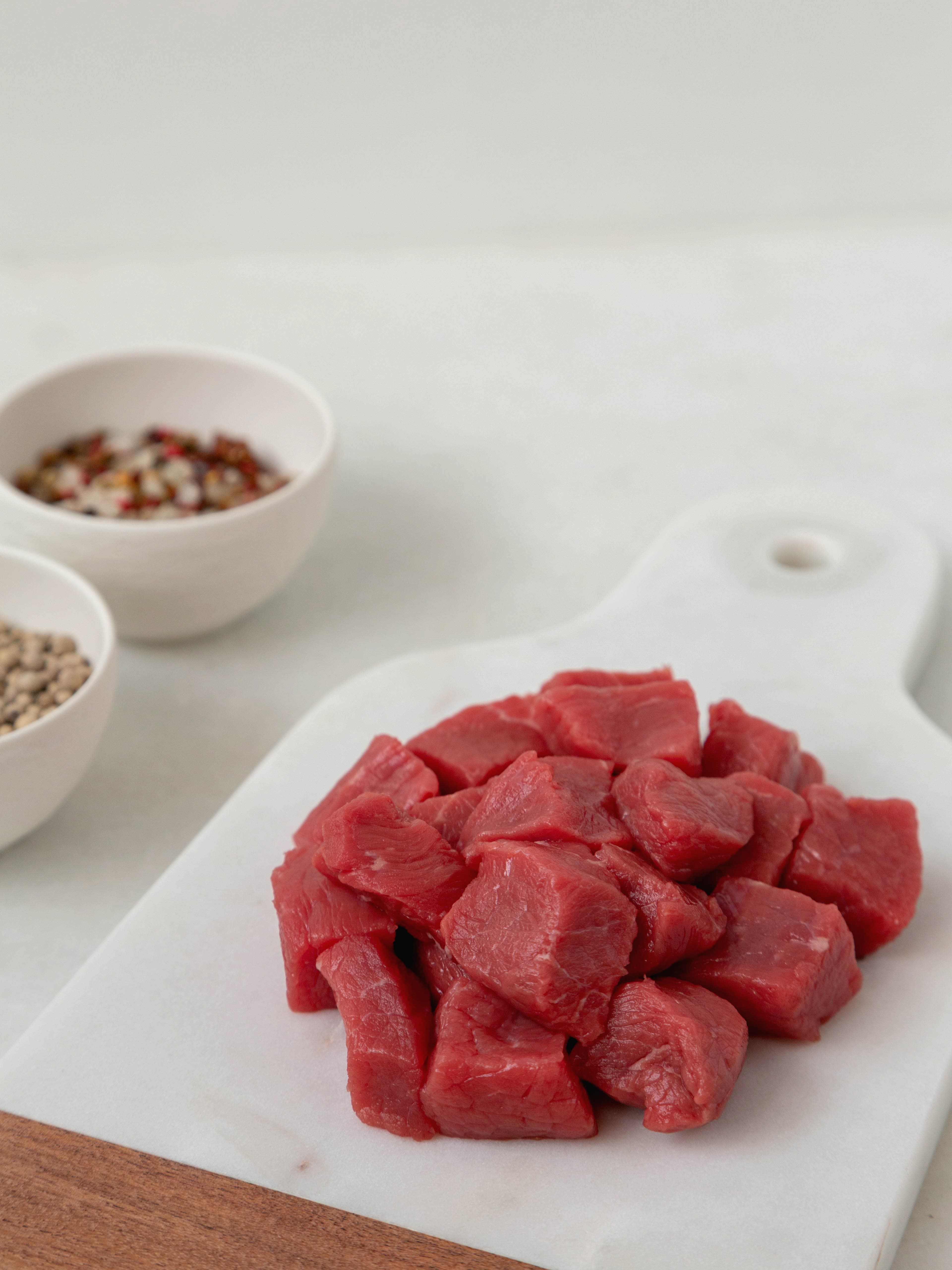 - Cortar la carne en cubos, salpimentar y saltear en una cazuela de fondo grueso cubierta con una fina capa de aceite de oliva VE. Una vez dorados los trozos retirar y reservar.