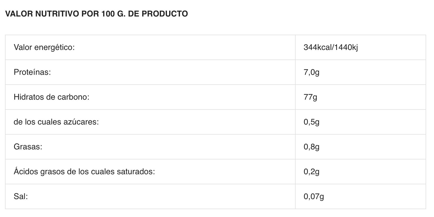 - Carbohidratos 77 g de los cuales azúcares 0,4 g