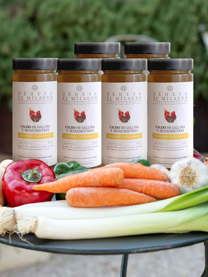 El caldo de gallina, hecho con gallinas criadas en nuestra granja, ofrece proteínas de alta calidad, vitaminas, minerales y fibra, gracias a las hortalizas, champiñones y setas shiitake. Estas setas no solo enriquecen el sabor, sino que también aportan compuestos que fortalecen el sistema inmunológico y poseen propiedades antioxidantes y antiinflamatorias, mejorando así el bienestar general.